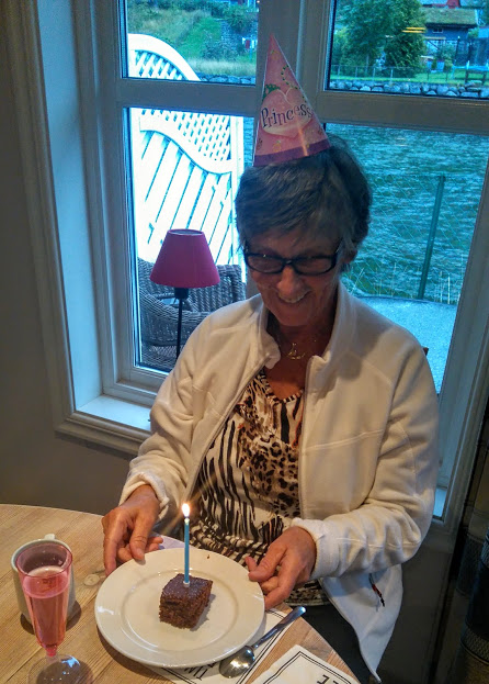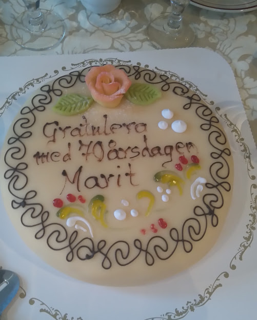 Jubilanten fekk sjølvsagt både hatt, kake med 1 lys (70 blei så himla mykje) og eit lite glas med bobler 🙂