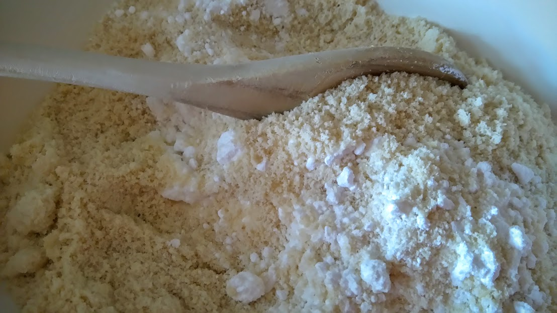 280g mandelmel (i dette tilfelle berre 200g) blandast med 370g melis (i dette tilfellet då litt mindre)