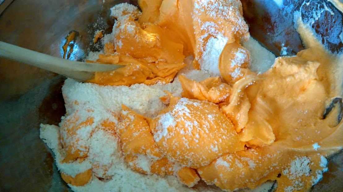 Så vender ein eggehviteblandinga i lag med melblandinga.