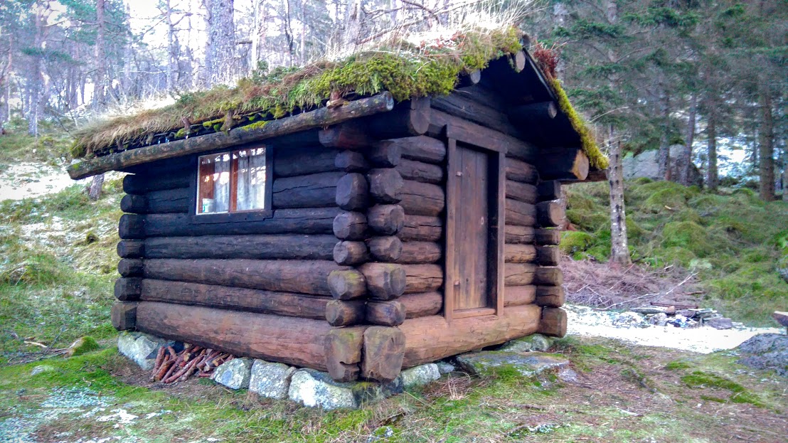 Nesten heilt oppe på toppen dukka denne velte idylliske hytta opp. Den er nok ikkje open for alle – i allefall var ho låst då vi kom forbi.