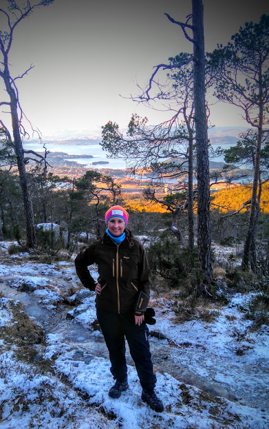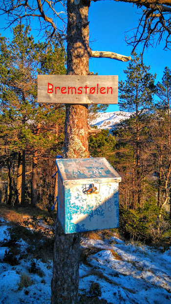 Om det var aldri så mykje sol på Bremstølen, så var det dessverre isande kald vind der 😦 Vi tok oss kun tid til å skriva oss i boka og fotografera litt før vi snudde nasen nedover skogen igjen….