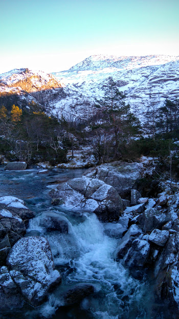Kaldt nok til at elva har byrja frysa til når vi nærma oss toppen.