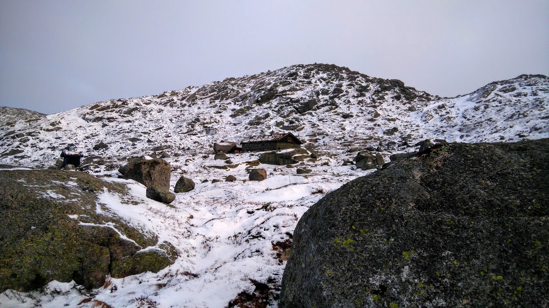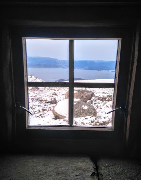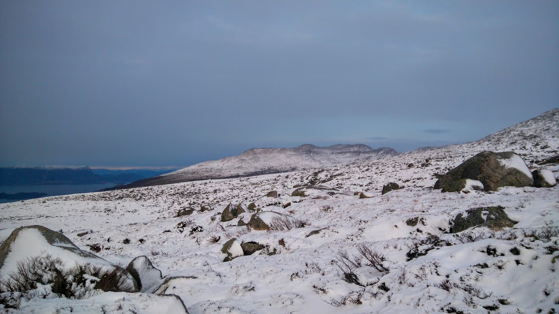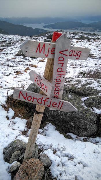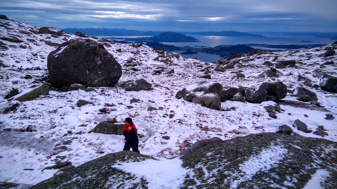 På veg opp gjennom skogen gjekk vi oss så varme at vi måtte hiva av oss kler. Dei måtte på igjen då vi kom opp på fjellet. Vi fekk eit lite verskifte der med snø i lufta og iskald vind.