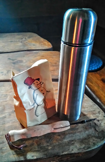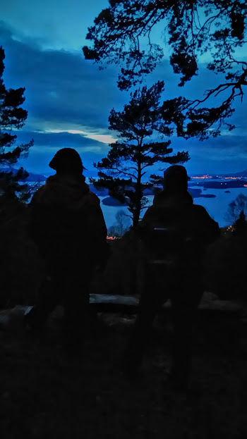 Vel å lenge sat vi her å kosa oss. Til slutt byrja Ann Irene og sjå på klokka – måtte vi ikkje snart byrja gå ned att før vi risikerte at det vart mørkt? Vi gav det ein halv time til og, litt som ein spøk, nemte eg at eg i allefall hadde lommelykt på mobilen. Så ringte sistemann og med beskjed om at ho hadde nådd siste skiltet. Då måtte vi jo venta til ho fekk koma inn å varma seg litt, grilla seg ei pølsa og drikka ein kopp kakao og før vi byrja på turen ned att.