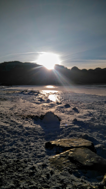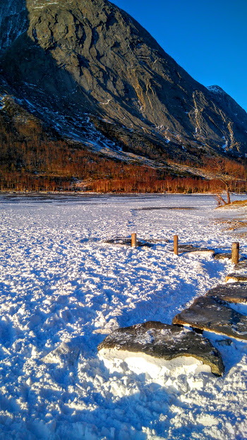 Appen vart lasta ned og, utan å bruka altfor lang tid, valgte eg meg ut den svenske krimboka Sandmannen av Lars Kepler. (Sandmannen er vel det same som vi på norsk kallar Jon Blund eller Ole Lukkøye). Køyrte nok eingong til Fjellandsbø, skrudde på lyden og byrja traska i den fine vintersola 🙂