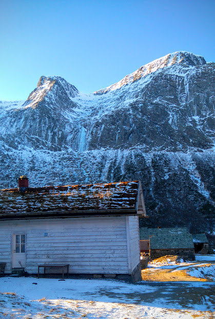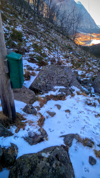 Nesten nede att, fekk eg akkurat knipsa dette biletet av eit av favorittmotiva mine før eg låg å kava på bakken så lang eg var. Eg datt på ræva når eg skulle starta turen her – og eg gjekk sjølvsagt overende same plassen på veg ned, sjølv om eg gjekk å passa på at eg IKKJE skulle skli eingong til! Eg må ha ein fallteknikk som gjer at eg MÅ nedi med venstrekneet og når eg dett, det fekk seg ein god kakk på veg ned i frå Vardhaugselet, og det var det som tok i mot no og. Gjekk greit, men kneet er no i allefall gult og blått….