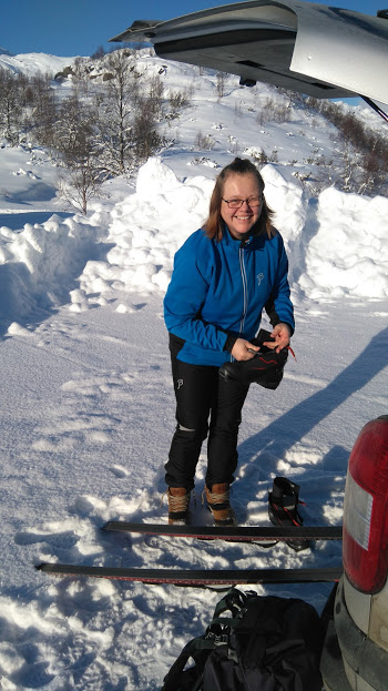 Det var to veldig glade damer som kunne ta av seg skia på parkeringsplassen i går 🙂 Dette hadde vore ein fantastisk, flott skitur. Farge etter sola hadde vi og fått – vart både brille- og hueskille i går. Såpass at eg vurderte om eg måtte klyppa pannelugg før eg gjekk på jobb i dag 😉