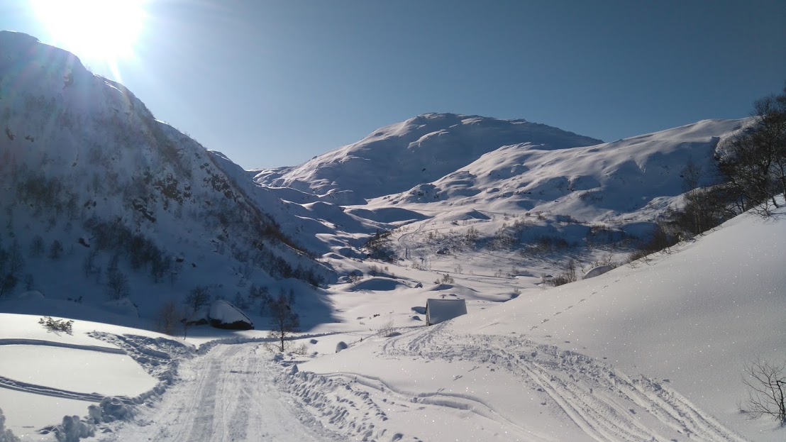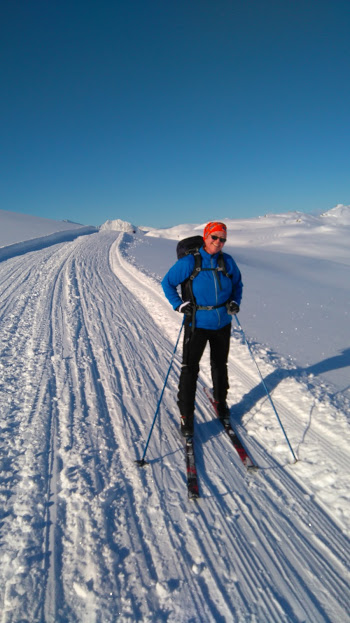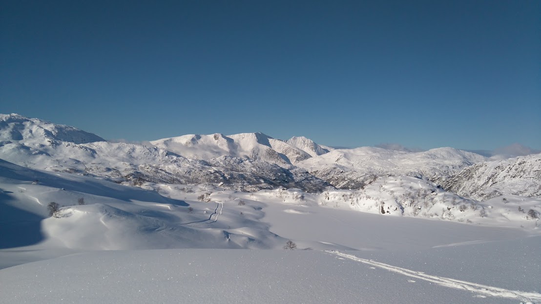 Strålande skiløype, blå himmel, sol som varma, fantastisk utsikt over alt og framleis ikkje eit vindpust – vi kunne ikkje vera meir nøgd med denne skituren. Faktisk trur eg at eg slo fast allereie her at det måtte vera den aller finaste skituren eg har vore på – ja, den slår faktisk dei par turane eg har hatt frå Utåker og opp på Ulvanåso, og det hadde eg ikkje trudd gjekk an!