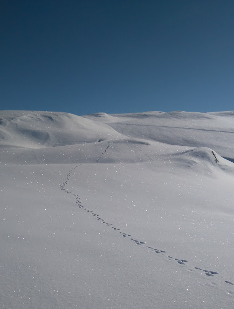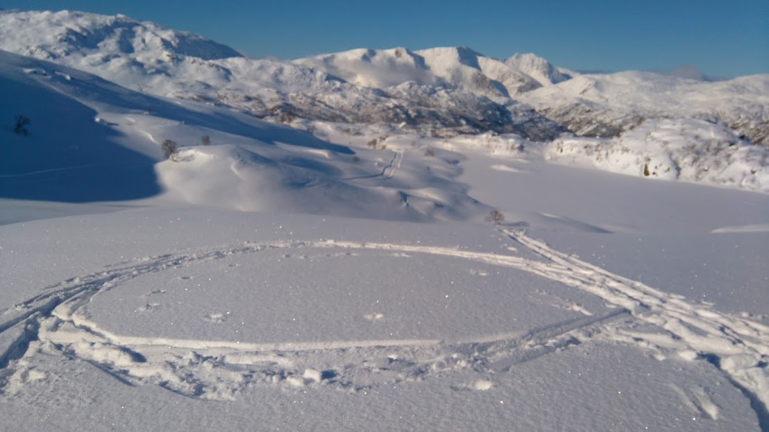 Her har det hoppa ein som ikkje har brydd seg om å fylgja løypa – og som dåke ser – han har hoppa langt 🙂