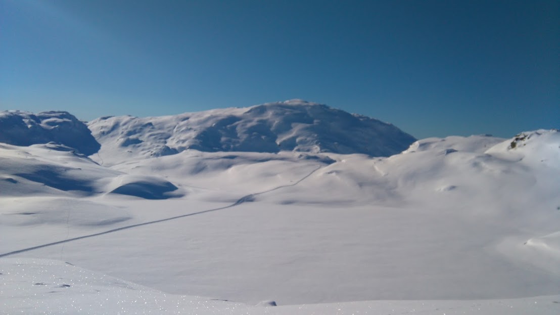 Tilbakeblikk mot Fagnabotn og i det fjerne skimtar ein løypa inn til Nautavatn. Ser dåke harespora? Eg la ikkje merke til dei før eg kikka på biletet 🙂