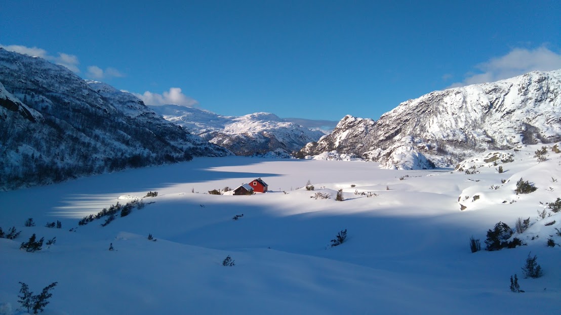 Nautavatn – tvers over her kom vi. Hytta skimtar ein så vidt i det fjerne.