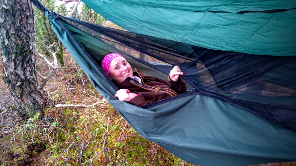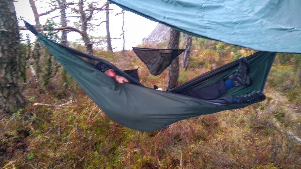 Og eg er veldig nøgd! Hengekøye med myggnetting, ei lita «veske» i «taket» kor eg kan ha mobil, litt godteri, ei bok, Ipad (!!!) etc. etc. Og med hengekøya kom det og ein tarp, og den var god å ha i dag, når det regna litt. Den kan eg ho ha med i sekken sjølv om ikkje hengekøya er med og. Ja, no gledar eg meg stort til at eg skal prøva hengekøya på overnatting 🙂