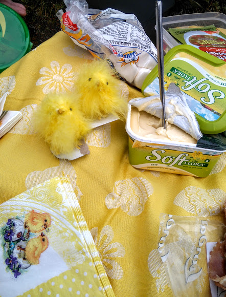 Eigentleg kunne vi jo berre ha blitt her eit par dagar, for Ann Irene og Marit hadde i allefall med nok mat til det. Eit skikkeleg påskematbord med spekemat, kjeks, druer, melkekaker og diverse anna godt 🙂
