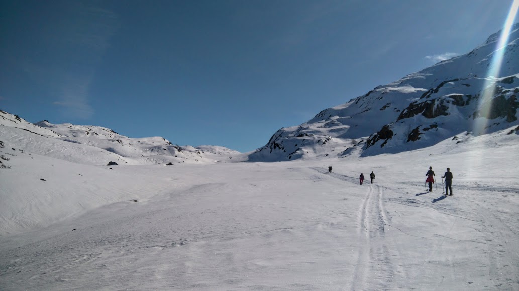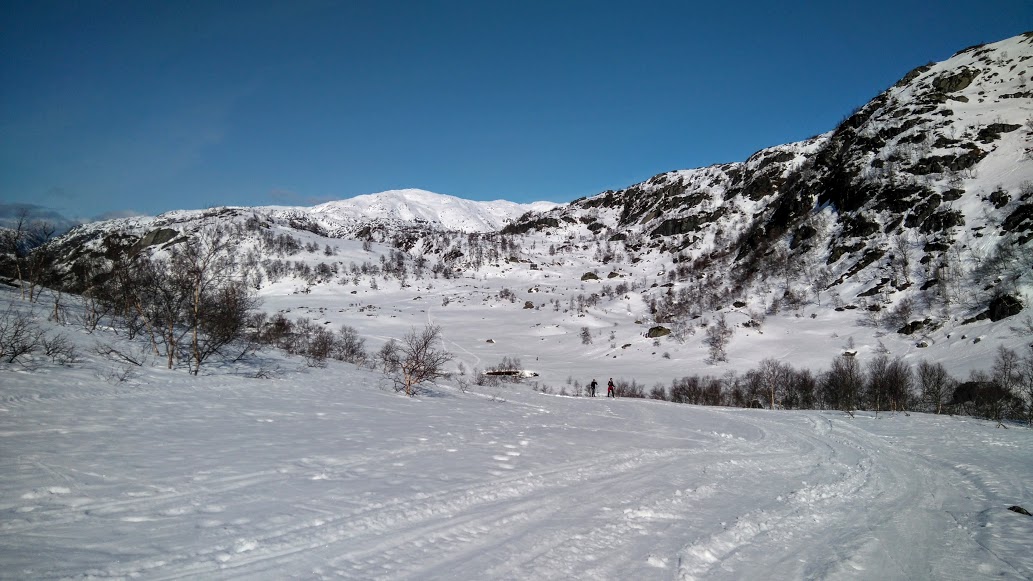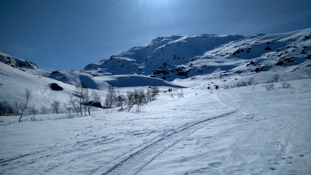 Nesten på Fagnabotn. Litt ymse føre. Sola hadde byrja ta litt, så det var ei blanding av mjukt og isete. Med kortfeller på spela ikkje føret noko særleg stor rolle 🙂