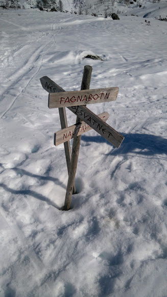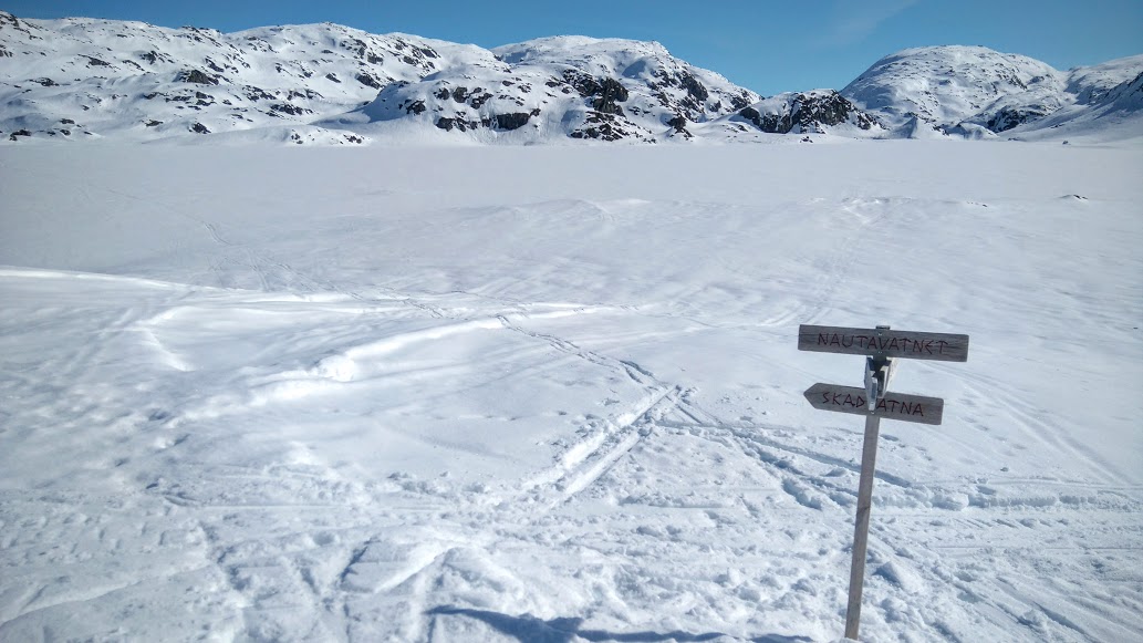 Det er ikkje særleg stabilt dette Påskeveret vi har fått utlevert i år – ikkje at det er så mykje meir stabilt ellers i året heller… Fyrste Påskeferiedagen min tirsdag: Skodde og regn. Men har ein tatt Påskeferie for å trena skigåing, så får ein og koma seg på ski. Eg køyrte opp i Fjellhaugen i 16.30 tida – og fekk lysløypa heilt for meg sjølv 😉 Men det plaga meg ikkje i det heile tatt – det var blitt opphald og det var mjukt og fint føre. Så mjukt og fint at eg forserte alle oppoverbakkar i fiskebein og heiv meg utfor alle nedoverbakkar utan tenkepause – og dei som plar vera med meg å gå ski veit at DET skjer ikkje ofte! Eg trur faktisk aldri dei har opplevd det i det heile tatt – og det var det jo ingen som fekk oppleva denne gongen heller ettersom eg var heilt åleina…..Ja, ja, eg får berre håpa eg tør vera lika tøff ein anna gong og 🙂 I går, onsdag, vakna eg opp til strålande, flott ver! Johoo – her var det berre til å få gjort unna litt naudsynte saker som handling og Polet tidleg… Når det var gjort, heiv eg skia i bilen igjen. Og om eg var aleina i fjellet tirsdag ettermiddag, så var eg i allefall IKKJE einsam i går. Det var jo det glade vannvidd med bilar, ski, stavar, folk etc. etc. på parkeringsplassen – eg måtte snegla meg opp på den øverste parkeringsplassen. I løypa opp mot Fagnabotn var det svart i folk som skulle på skitur i finveret. Eg hadde tenkt meg ein liten tur til Nautavatn, så eg heiv meg inn i køen.