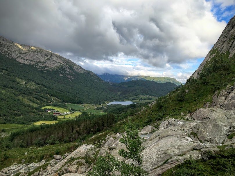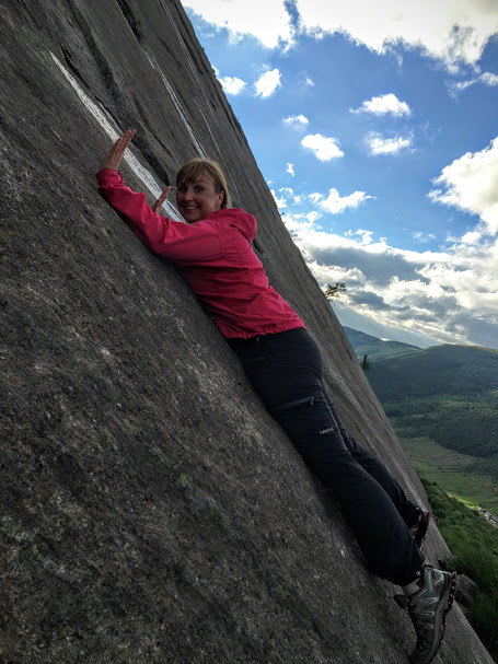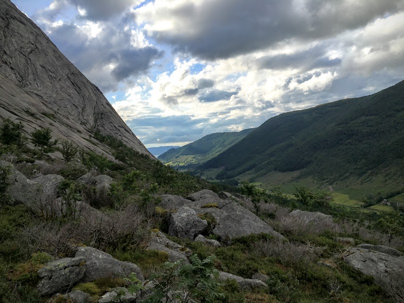 Riktig så tøff følte eg meg der eg hang og kikka utover dalen. Og eg må jo ha sett ut som eit klatrenaturtalent for Ann Irene, for ho sat seg ned og byrja fikla i sekken sin etter eit eller anna, medan eg hang og haldt meg fast etter fingerneglene. » Hallo i luken!!!», «Trur du eg klarer å henga her til evig tid?? Du skal no vel ikkje røyka no?? Ta bilete så eg kan klatra ned att!!»