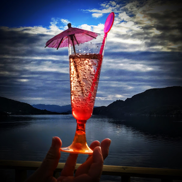 Det vart ein vakker kveld – sol og fint ver – og vi kosa oss med drinkane våres og etterkvart litt spekemat til solnedgangen.