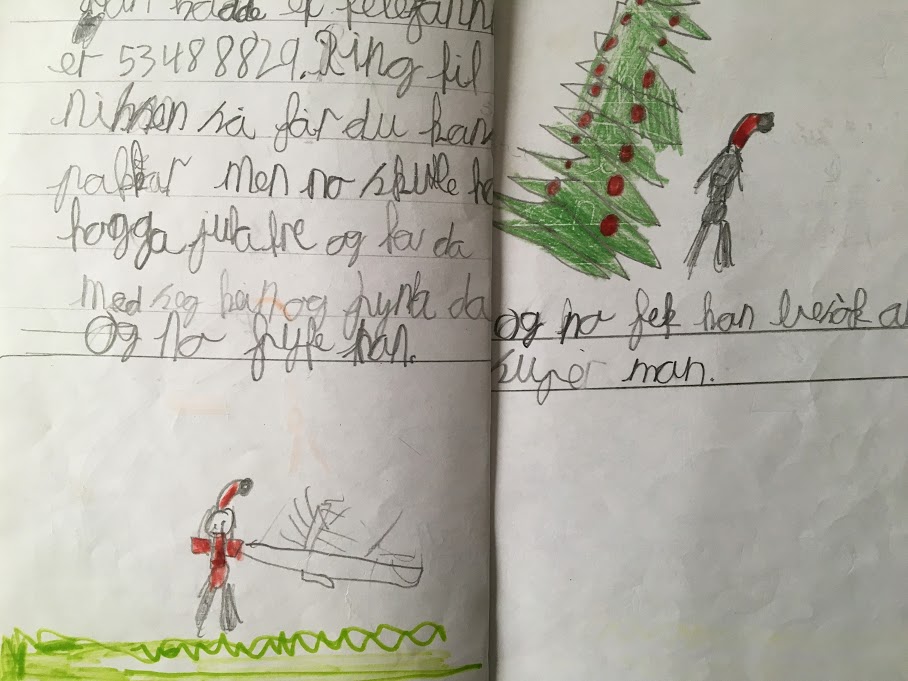 Han hadde eit telfannnumer er 53488829. Ring til nissen så får du kanskje pakkar men no skulle han hogga julatre og ta da med seg heim og pynta da. Og no pynta han. Og no fek han besøk av super man.»