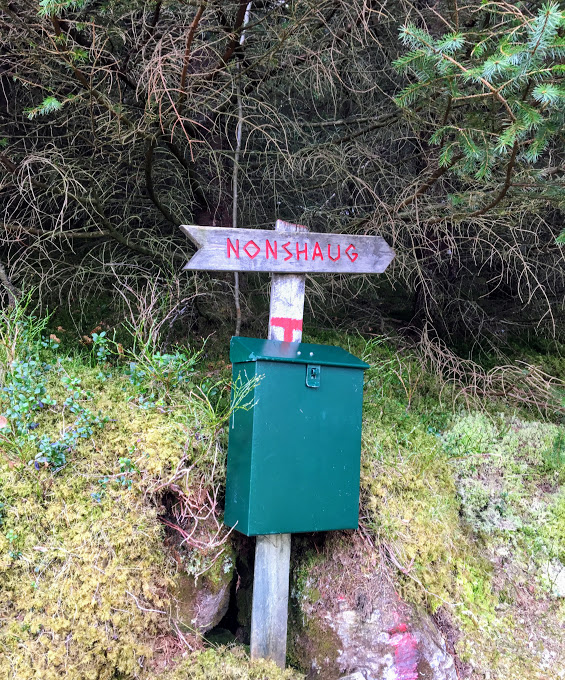 Når ein har nådd denne postkassa og skiltet, går ferda vidare på sti.