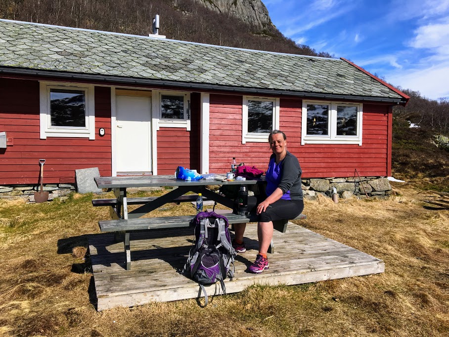 Hadde vi visst vi skulle på så lang tur, hadde vi kanskje leigd hytta på førehand. Som sagt så er vi ikkje i vår beste fjellform enda, så å seia at vi ikkje kjente turen i beina no, ville vera å lyga ein liten smule. Vi tok oss ei lengre pause her før vi tok fatt på siste etappe opp lia og ned Pålavegen. Vel nede hadde vi tinga ho mor til å henta oss – vi hadde jo bilen i Omvikdalen….