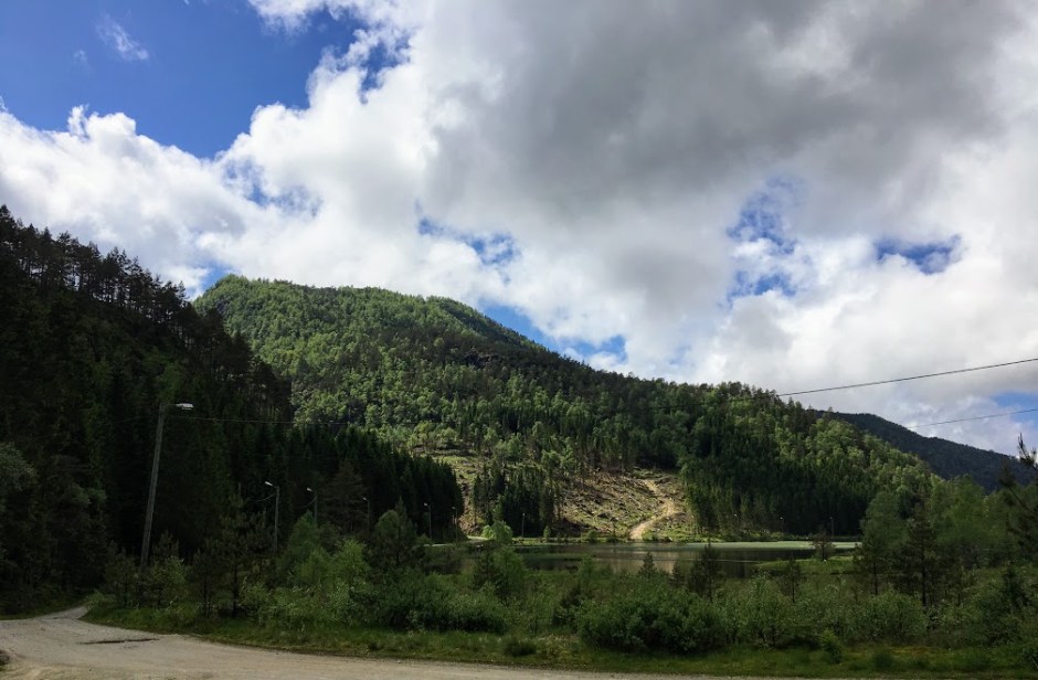 Skogsvegen fortsatte til venstre langs vatnet, men det gjekk og veg på høgre sida. Men skulle ein gå den til høgre, må ein komma seg over ei lita elv – og det lot seg ikkje gjera denne dagen utan å vassa. Heldigvis kom det nokre kjentsfolk og redda meg frå den vassinga. Dei kunne fortelja at hvis vi gjekk rundt vatnet til venstre, kom vi fram til ei lita hytte i enden. Gjekk vi litt forbi den kom vi til å få utsikt rett ned i Matrefjorden.