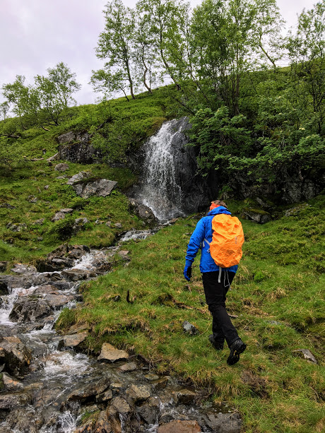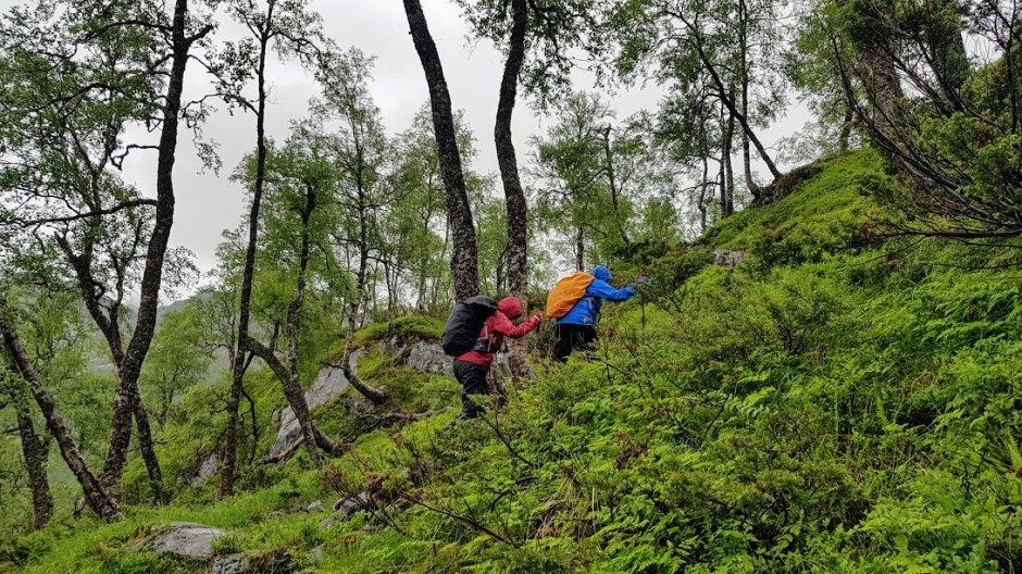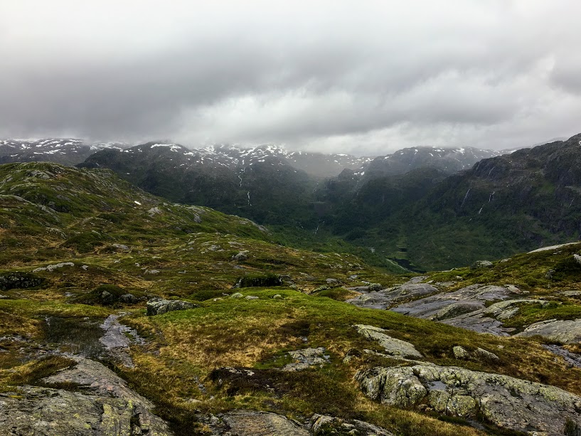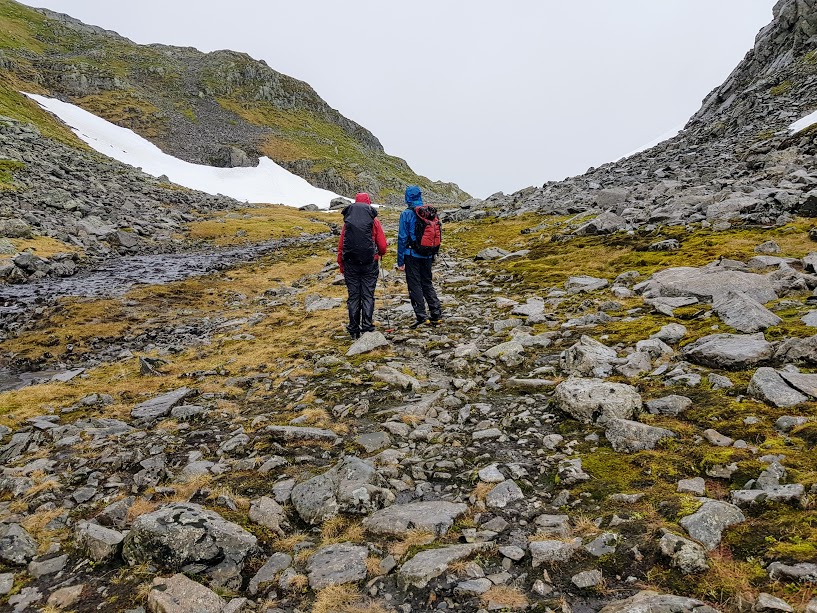 Eg vart positivt overraska over stien oppover. Eg innbilla meg at vi skulle gå rett opp lia, men slik var det ikkje. Det gjekk oppover, men og litt på tvers slik at det ikkje vart så bratt som ein skulle tru. Det gjekk i grunnen leikande lett oppover. At det regna gjorde ingenting – og det var heilt grei turtemeperatur.