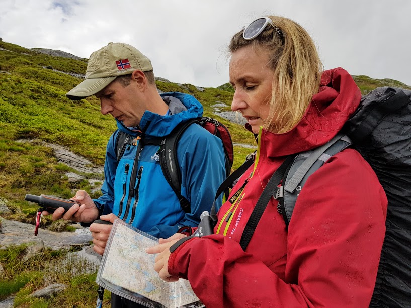 Men tru no for all del ikkje at dei to andre då stola på at det var EG som skulle guida dei fram til Bjellandsbu! Svein Vidar hadde sjølvsagt plotta løypa inn på GPS’en på førehand. Eg har i det heile ingen betenkelegheitar med å gå i fjellet okkesom ver og føre hvis vi er utstyrt med Svein Vidar – då veit vi at vi har både kart, GPS, naudpeilesendar og alt ein treng for å finna fram dit ein skal med i sekken 🙂