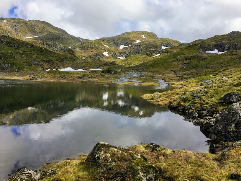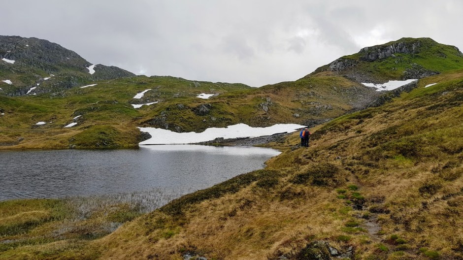 Sjå kor flott det var her! No gjekk stien langs dette vatnet, men steig nesten opp til snøfonna på høgre side.