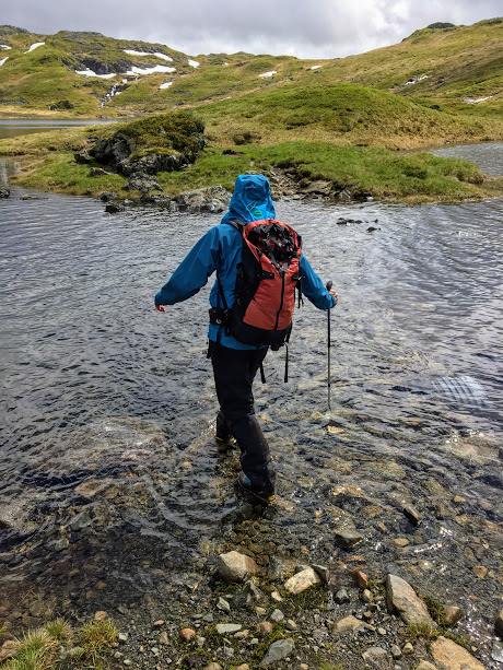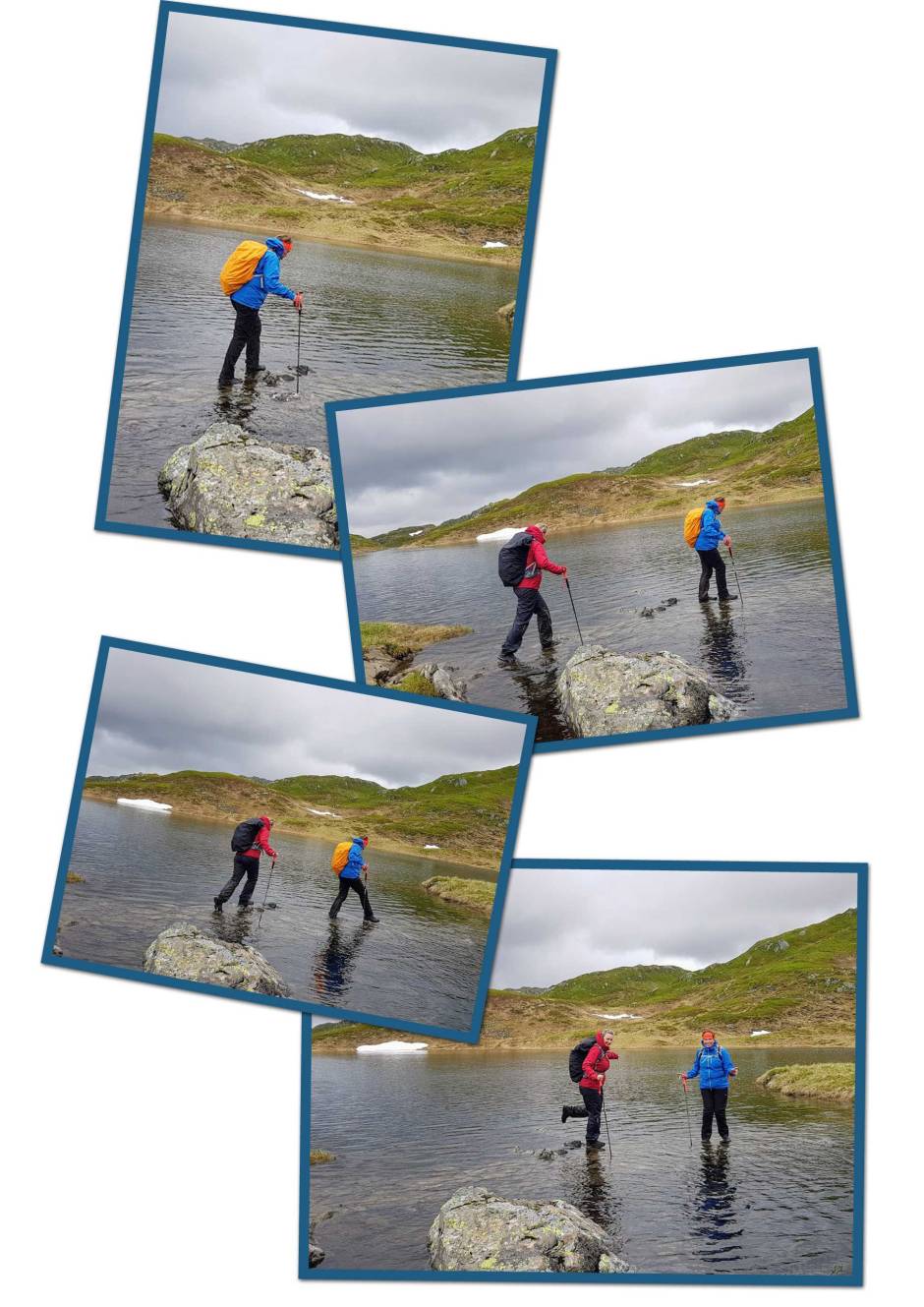 Eg kom stavrande etter. Eg prøvde fyrst å gå på dei steinane som stod mest opp frå vatnet, men dei fleste låg jo uansett under vassflata. Det gjekk fint fyrste halvdel over, men så fann eg ut at her var det berre til å peisa på å koma seg over – eg kunne jo ikkje bli våtare på beina enn eg var utansett 🙂