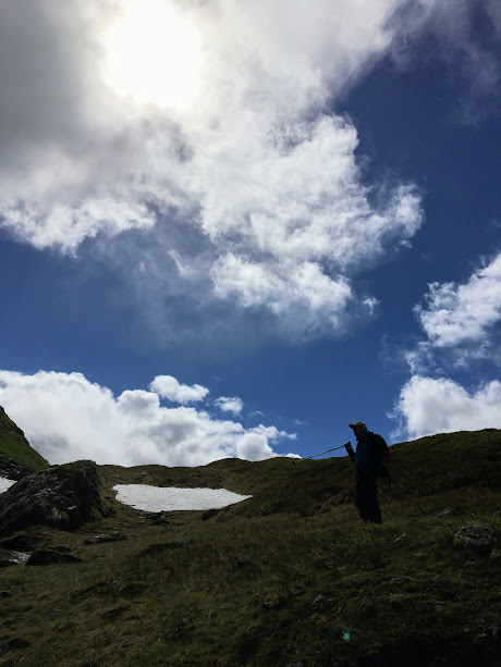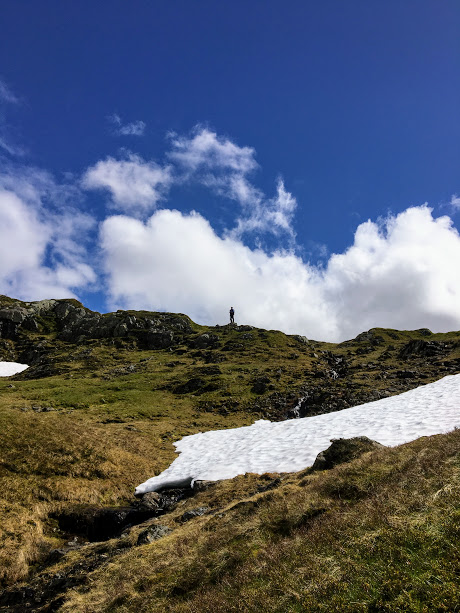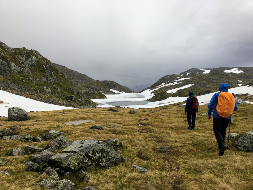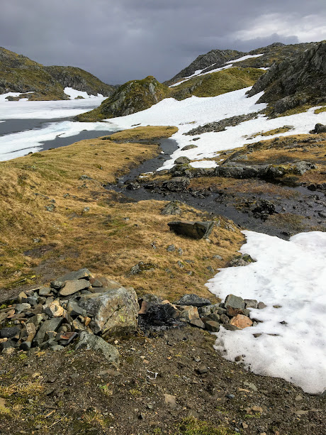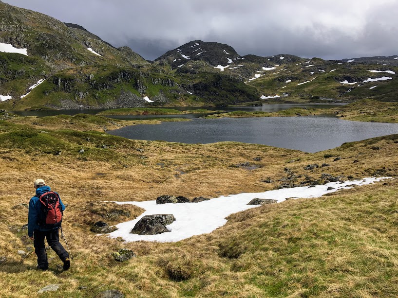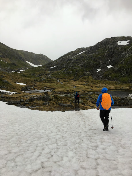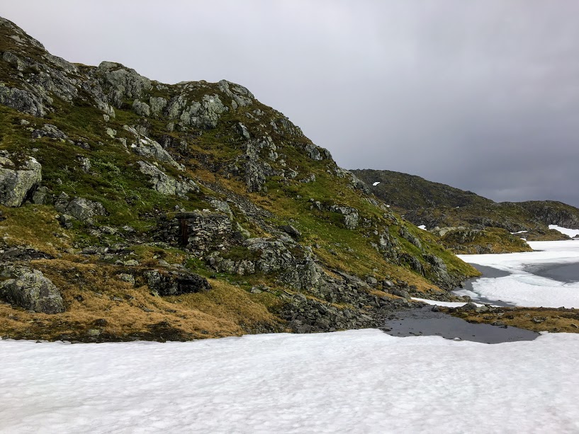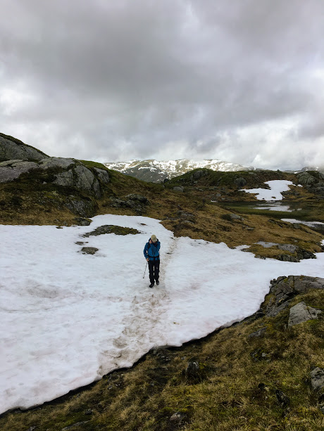 Snøen forsvinn sikkert fort i fjellet no, men vi hadde enda fleire slike snøfonner vi måtte over.