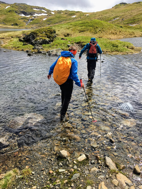 Og det stemte 🙂 Her forsvann stien litt for oss, men Svein Vidar hadde på GPS’en sin at vi skulle kryssa vatnet på midten, så det var berre til å gå i den retning. Og det tok ikkje lang tid før vi var på stien igjen.
