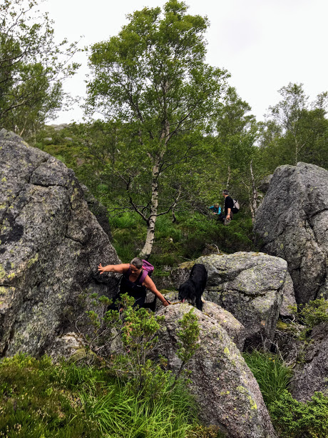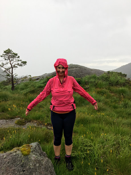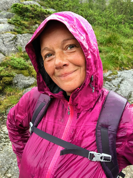 Etter å ha kome eit stykke nedover, byrja det sjølvsagt å regna. Eg hadde ikkje regnkler med, kun ei tynn jakke som var ganske kjapp å ta på. Ann Irene hadde med regnjakke, den var og ganske kjapp å få på. Dei andre trur eg var meir forberedt og hadde regnkler med. Ann Irene og eg byrja å gå på ned igjen og vi regna med dei andre kom etter. Men dette var faktisk det siste vi såg til dei, så dei må ha valgt å ta ein anna veg etter å ha fått på seg regnkler.