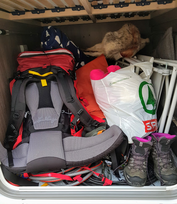 Ja, eg blir litt mobba for ustyrslista mi, eller mangel på sådan… Men det skjønar eg ikkje heilt – eg tar jo berre med det mest naudsynte? Og når du har ein heil bubil du kan pakka i???