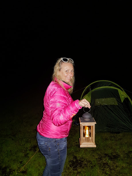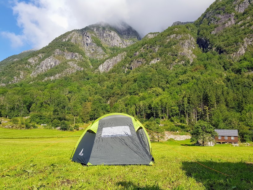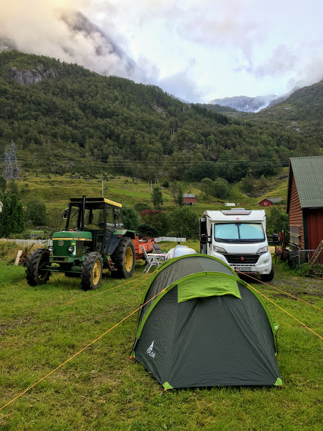Fin ny teltplass fann vi på vegen. Men då må Jorunn og i telt att – kan ikkje køyra bubil opp her 🙂