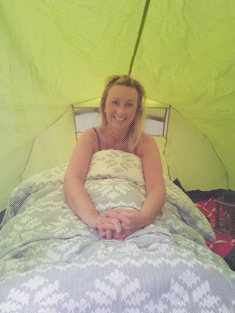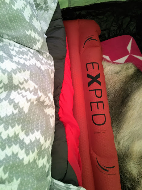 Det skulle no berre mangla at eg ikkje fekk sova, slik som eg hadde rigga meg til. Nederst på teltbotn hadde eg eit strandpledd, så reinsdyrskinn, deretter liggjeunderlag, så sovepose, og tilslutt dyna 🙂 Såpass må det vera – vi køyrte tross alt bubil, og der er det jo plass til det meste i bagasjerommet…