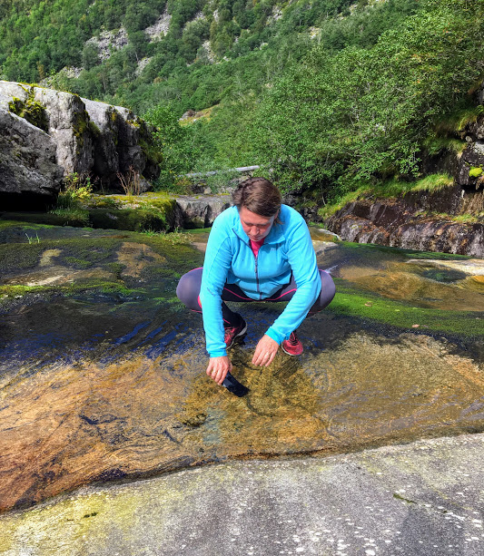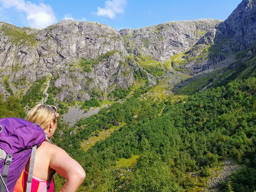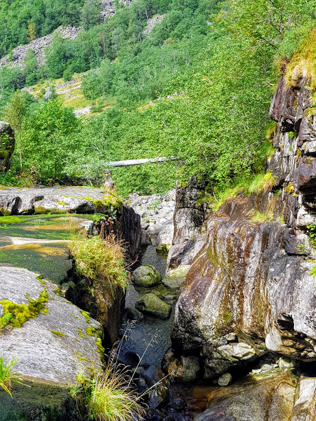Heldigvis gjekk stien litt lenger oppover til ein plass vi kunne gå rett over elva utan å risikera livet 🙂 Her hadde vi ei lita drikke- og sjokoladepause for no hadde vi brukt for energi. No skulle vi nemleg opp Lonelia. Det har nok vore ein veg opp her for lenge sidan – det var denne vegen lokalbefolkninga brukte då dei slutta å gå opp Hardingaskaret når dei skulle til Odda.