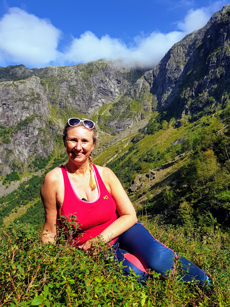 Heldigvis, får vi vel seia, kom gårdseigaren innom oss og fekk oss på betre tankar. Han såg vel på desse to, middelaldrande, ein smule lubne (unnskyld, Jorunn) damene som, i dette tilfellet i allefall, totalt mangla sjølvinnsikt, og tenkte at dette kjem ikkje til å gå bra… Og så foreslo han at istadenfor å gå opp Hardingaskaret så kunne vi gå mot høgre og gå opp Lonelia til Mysevatnet. Det var ein fin tur – og ikkje fullt så bratt.