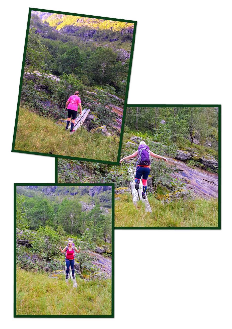 Mor og far kan slappa heilt av – vi våga oss sjølvsagt ikkje lenger enn 20cm ut på dei stokkane. Det var mykje lenger ned i juvet enn det ser ut på dette biletet!