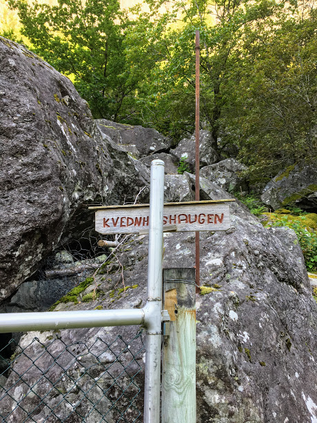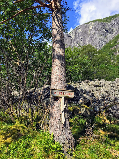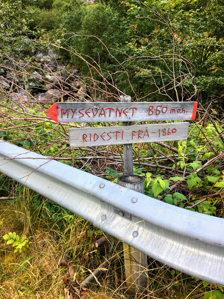 Her er det siste skiltet vi traff på. Omtrent i dette området trur eg at stien opp til Hardingaskaret byrjar. Det er ikkje skilta eller merka, såvidt vi kunne sjå. Det er ikkje sikkert ein vil at folk skal gå opp der, forståeleg nok.
