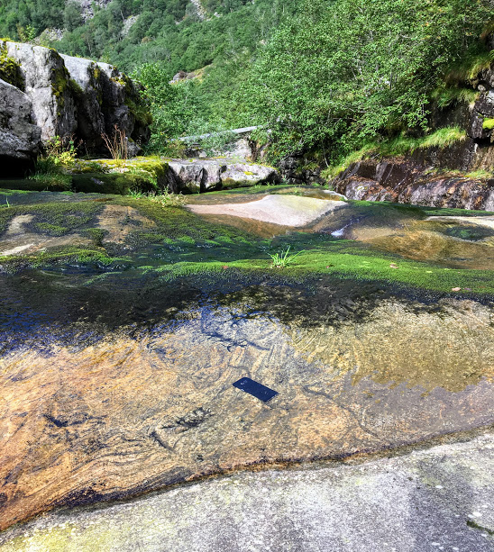 ….og der bada mobilen til Jorunn! Hadde det vore min, hadde jo eg stupt med hovudet fyrst etter, medan Jorunn sat stille og åt sjokoladen sin og sa heilt roleg: «Den er vanntett».