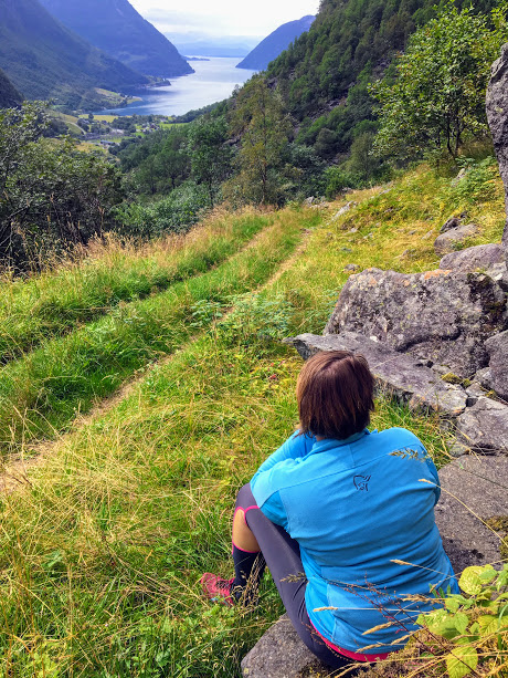 Sjølv om det var bratt, syntes vi det gjekk fint med oss oppover. Det var glatt, mykje gras, mykje stein og litt vanskeleg å sjå om vi trødde på stein eller i eit hol, så det var sånn sett ikkje den enklaste plassen å gå. Vi hadde jo i utgangspunktet ikkje tenkt oss på ein slik tur då vi tok ut på bubilturen, så Jorunn hadde berre joggsko på – og det var ikkje heilt rett skotøy opp her. Eg, derimot, hadde sjølvsagt fjellsko på. Eg hadde jo og sekk og matboksar med. (Det var jo tross alt god plass i bagasjerommet på bubilen 😉 Stavar mangla vi begge to – det hadde vore greit å ha med seg her.
