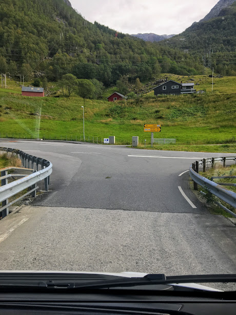 Det gjekk jo strålande, fint å køyra bubil mot Mauranger. I det vi nærma oss måtte vi byrja å sjå oss om etter overnattingsplass. Vi ville ikkje stå på campingplassen, så vi leita etter ein anna plass. Men det skulle bli litt vanskelegare enn vi hadde sett for oss. Dvs. det var ikkje så vanskeleg å finna plass til bubilen, men der den kunne stå, fann vi ingen plass til teltet mitt! At eg hadde med hengekøya (det var jo plass i bubilen) og, tenkte vi ikkje på – kanskje det hadde vore lettare å finna noko om vi hadde kikka etter to trer…