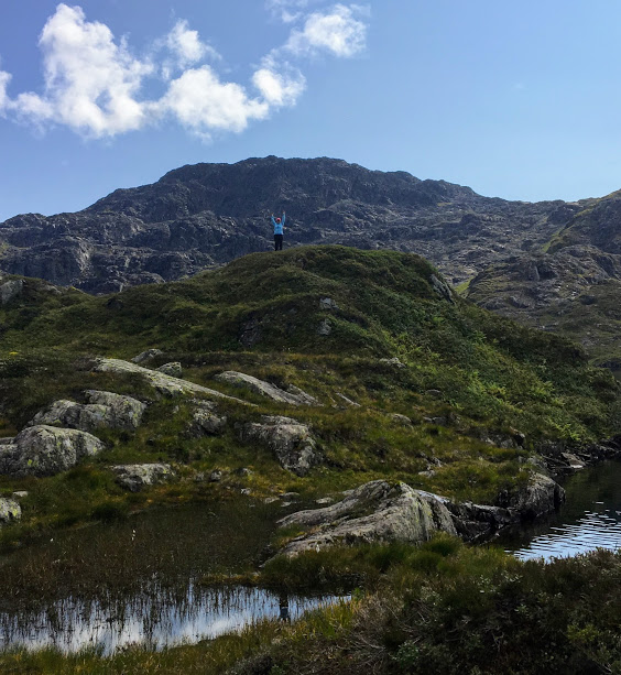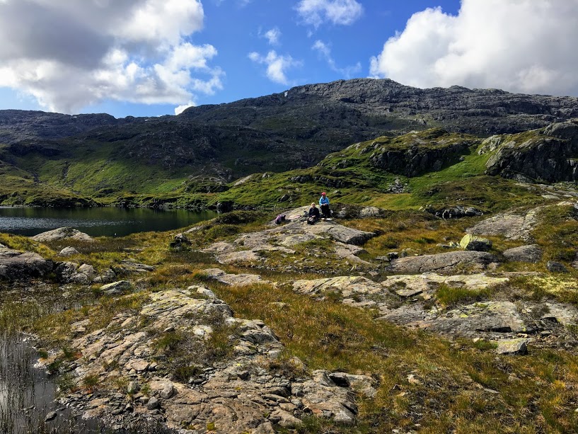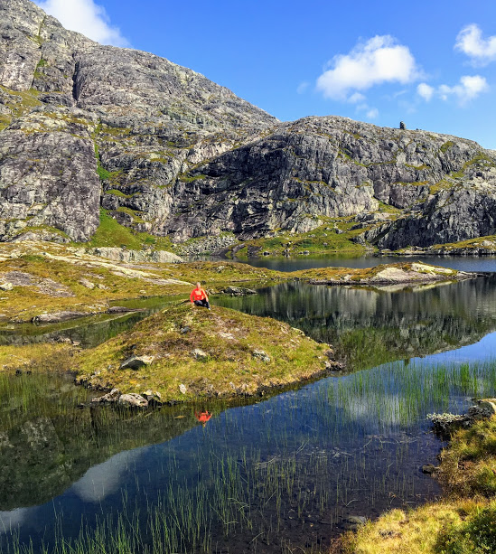 Det er ganskje nedtappa vatn på denne tida. Eg har aldri stoppa her før, så eg var ikkje klar over at ein herifrå ser rett inn på Blådalshytta 🙂 Det er ikkje så lett å få auga på ho på dette biletet, men ho er der – i fjellsida i andre enden av vatnet 🙂