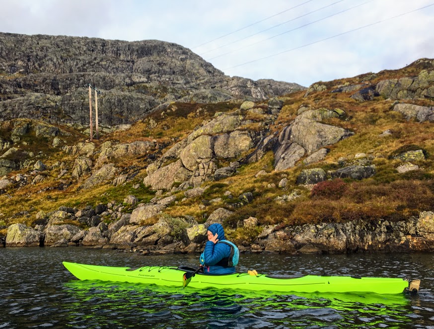 Vi trudde jo no at vi skulle peisa full fart over til andre enden av vatnet, men sidan det var litt ruskete så byrja vi padla langs land. Og her kjem den «heldigvisen» ovanfor inn – for her var det overraskande flott, fint og kjekt å padla!