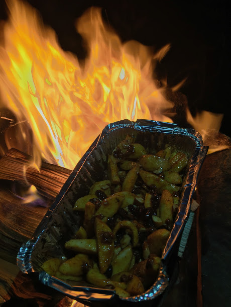 Eg syntes eg hadde forsømt meg litt i helga – eg hadde jo ikkje hatt med meg noko spanande i pikkpakket mitt, difor måtte eg overraska Jorunn med dessert i går kveld. Så enkelt og så godt – blanda saman epler, rosiner, hakka mandlar, hakka hasselnøtter og daimkuler (skulle vore sjokolade plettar, men det fann eg ikkje. Heldigvis, for daimkule satt som ei kula og skal frå no av alltid brukast 🙂 ). Så var det berre til å blanda det godt, varma det på bålet….