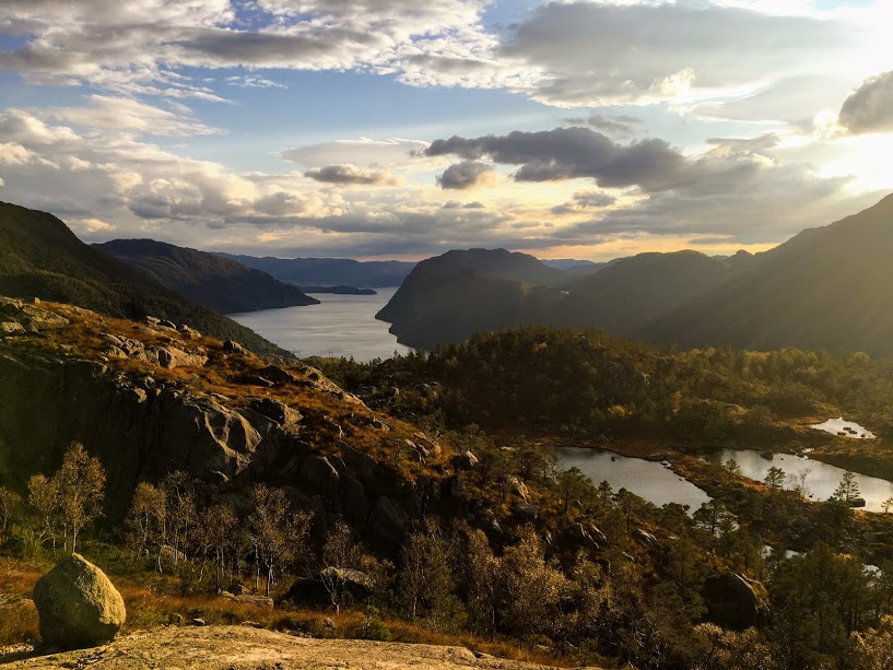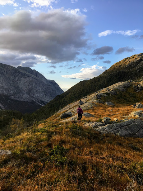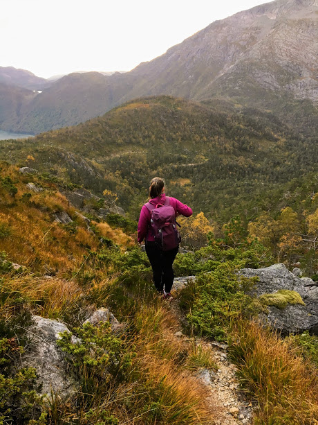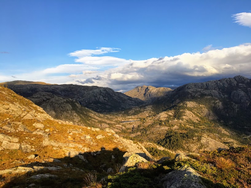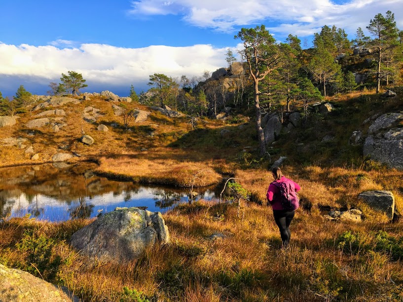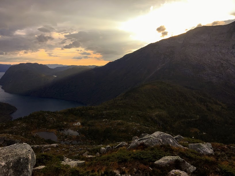Når vi er her, plar vi gå opp på den yttarste toppen til høgre slik at vi får utkikk rett ned i Matre og Matrefjorden. I går bestemte vi oss for å fylgja ein sti mot ein anna topp til venstre – for der hadde ingen av oss vore før 🙂