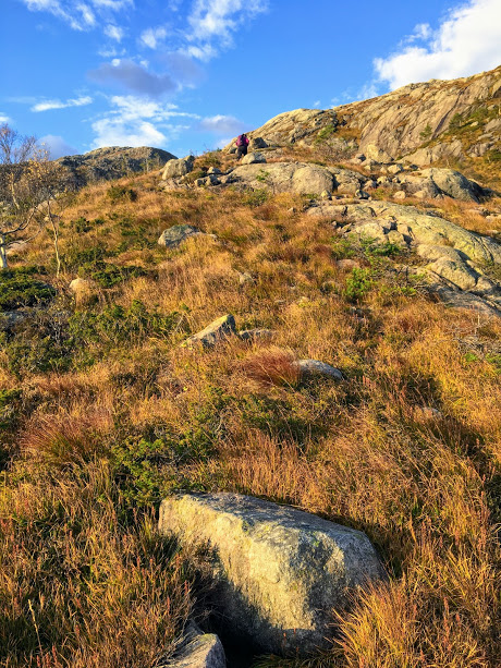 Vi vart einige om at vi i allefall skulle gå den vanlege stien ned att. «Det er bratt ned. Eg tru vi må koma oss ned før vi et mat, så ikkje det blir mørkt på oss», sa Ann Irene. «Hæææ!!» svara eg. «Ja, men det blir fort mørkt.» Ho hadde sjølvsagt rett.