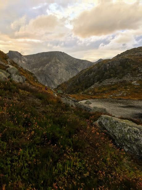 Vi måtte no flira litt av oss sjølve der vi virra rundt og prøvde å fylgja stien ned mot Fjellandsbøvatnet att. Svoltne var vi begge to, så no måtte vi snart få opp denne gapahuken Ann Irene hadde båre på langt og lenge.