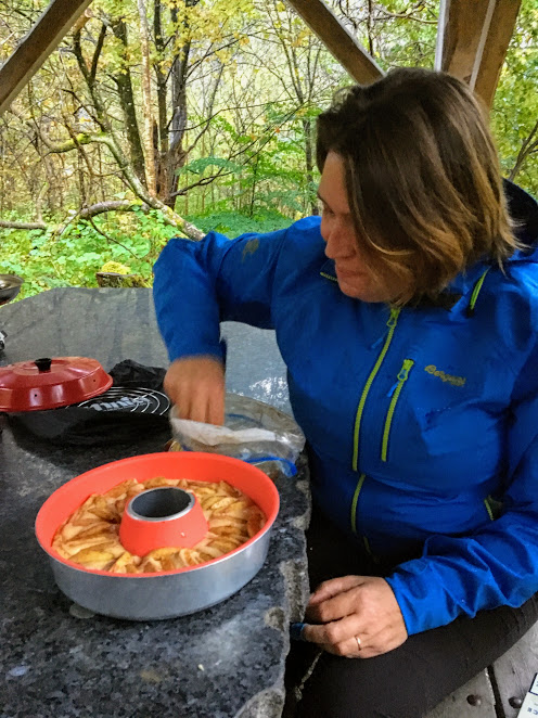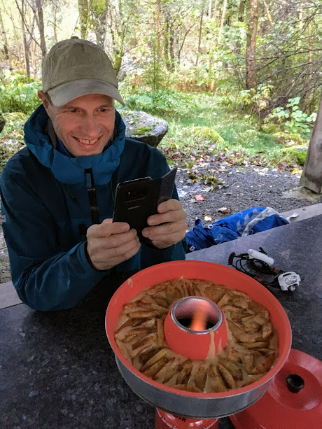 Går det an å bake kake på tur? Ja, det ville vi finna ut i kveld. Jorunn inviterte på prøving av kakebaking i den nye Omniaovnen sin, og eg var ikkje sein om å takka ja 🙂 Alt eg trong å gjera var å stilla ved porten til Baroniet kl.1800 -og ha med ei eplekakerøra 😉