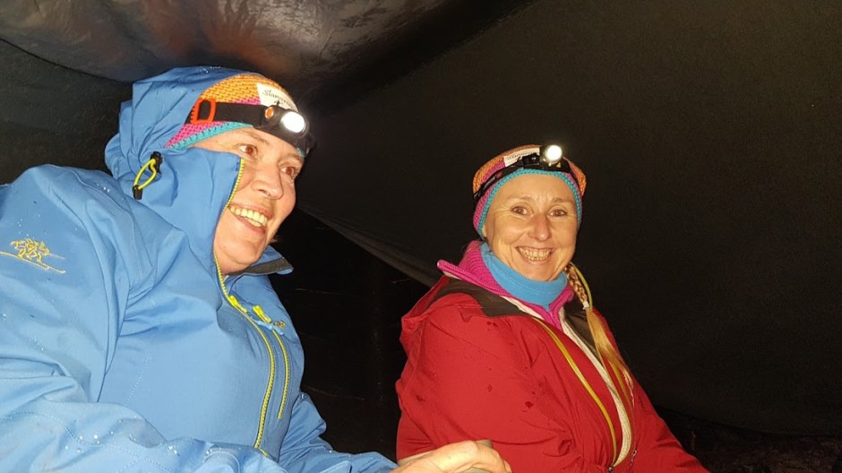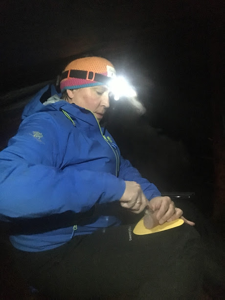 Ja, ja, gode og mette og godt nøgd med kveldens utflukt, pakka vi ned sakene våres, rista haglet/snøen av tarpen og…